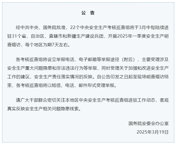 新華社北京3月19日電 記者19日從應急管理部獲悉,2025年度中央安全生產考核巡查一季度安全生產明查暗訪日前正式啟動。由國務院安委會有關成員單位負責同志帶隊的22個中央安全生產考核巡查組陸續進駐31個省份和新疆生產建設兵團。